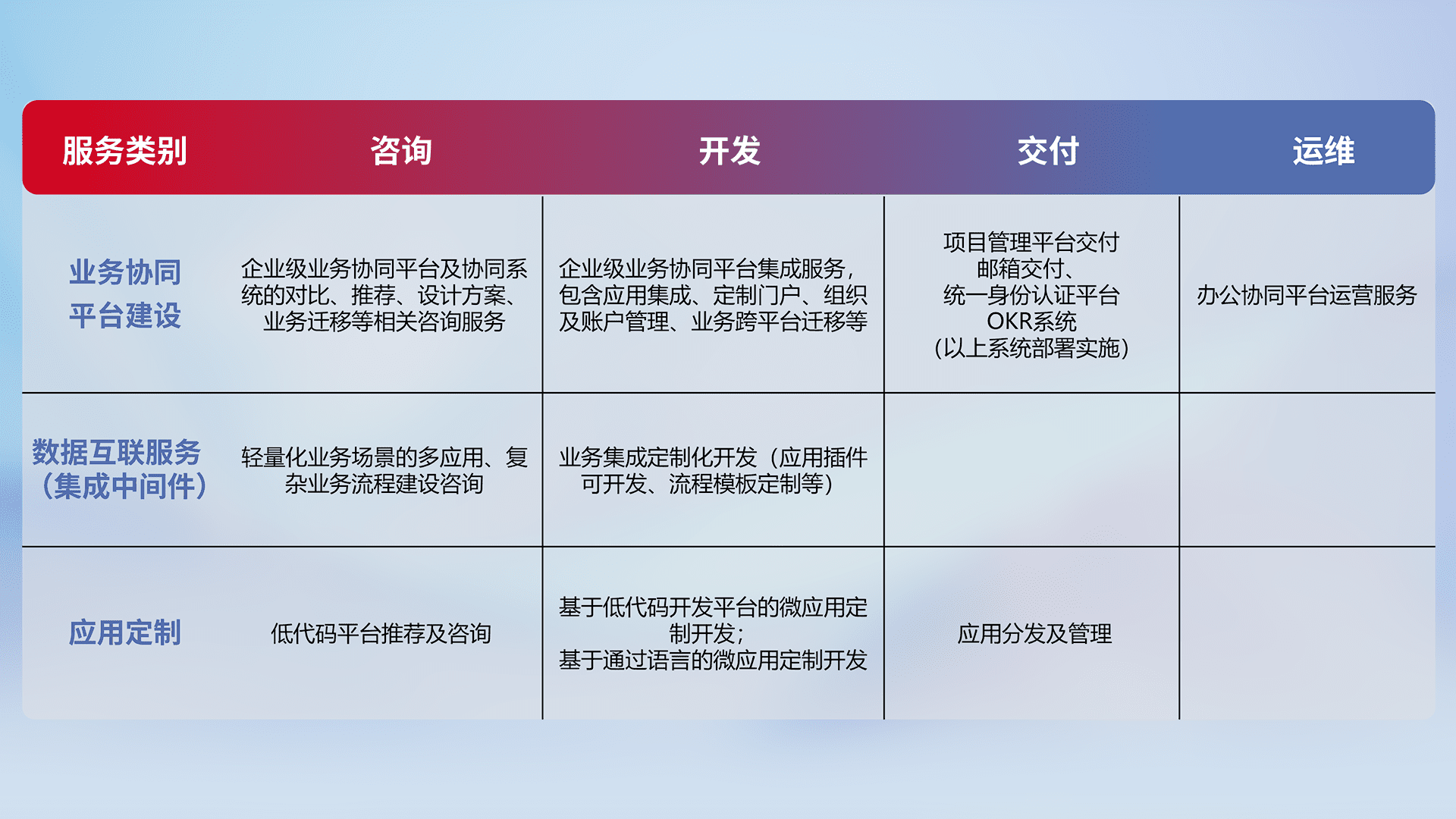 针对钉钉、、、企微、、、IDaas等平台级产品提供产品的规划、、、、方案、、、、交付、、、、定制化开发等服务,,实现如统一协同办公、、、智能客户服务、、混合会议管理、、、、智能数据查询、、、、等业务场景,,实现数字化转型。。